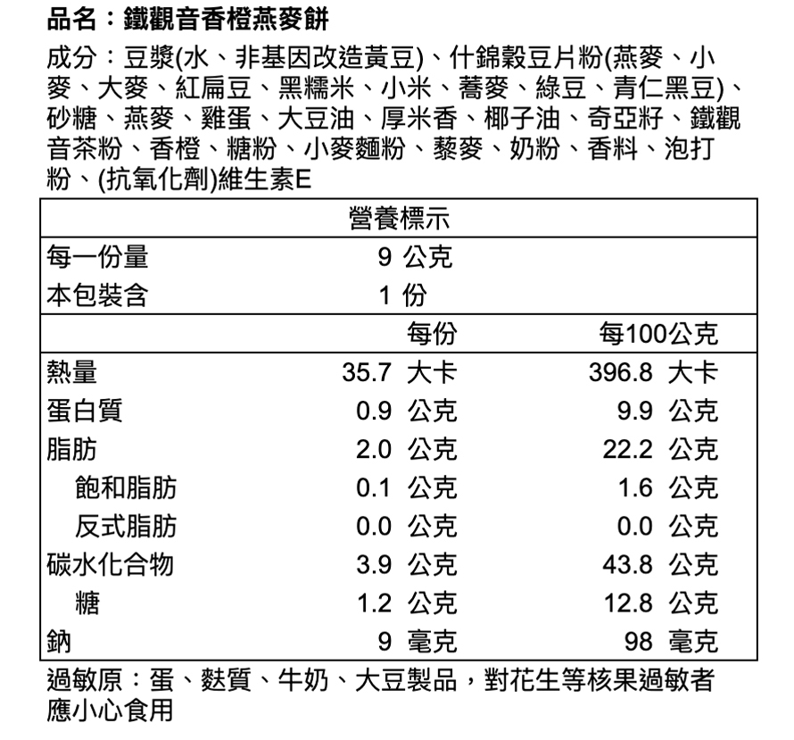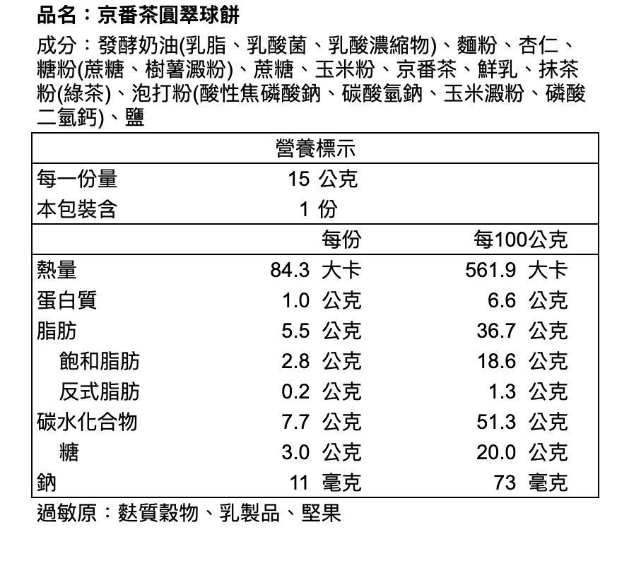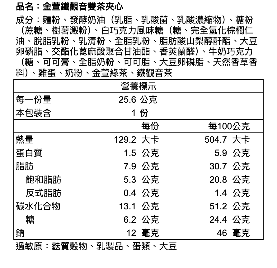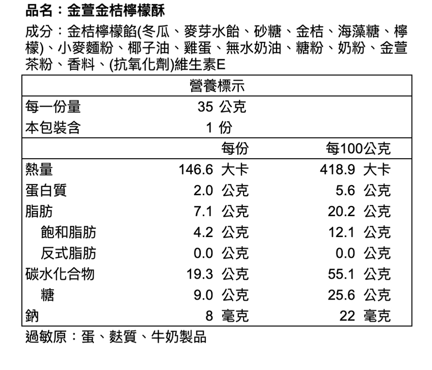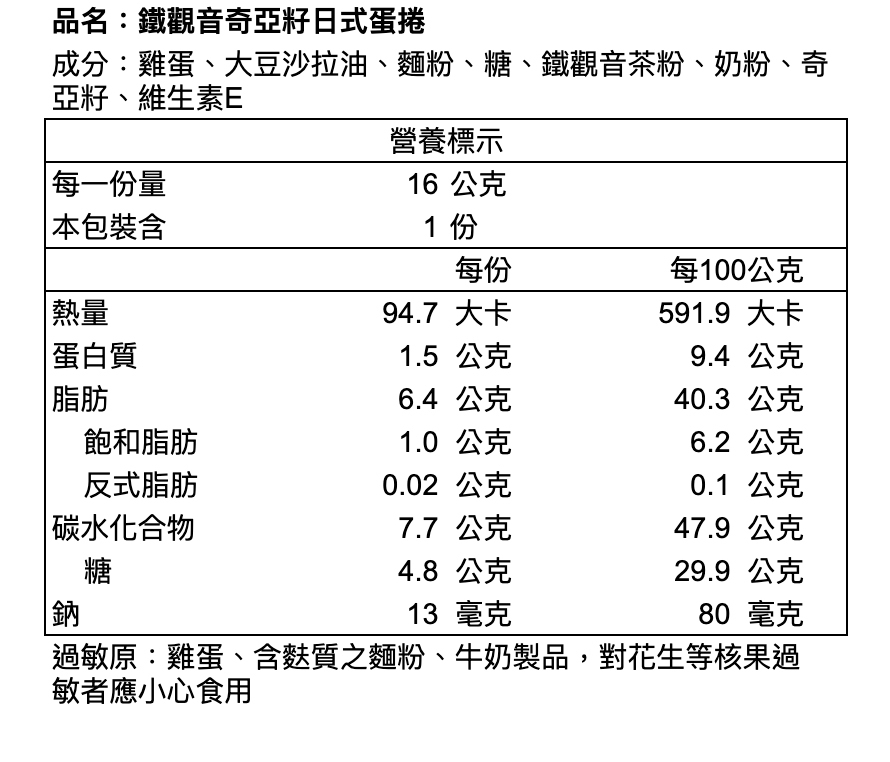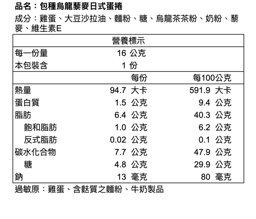 ※本產品與其他含蛋、牛奶、含麩質穀物、大豆、芝麻、花生、芒果、堅果類、種子類、魚類、甲殼類及其製品於同一產線生產,對此類食物過敏者請避免食用。
