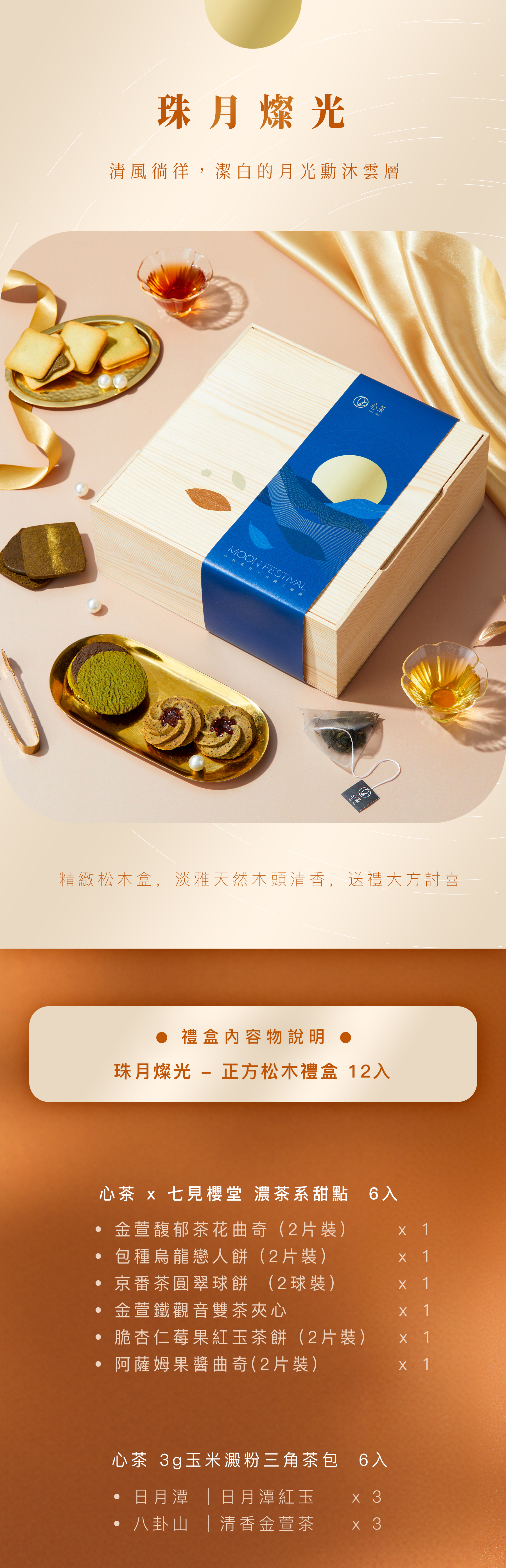 【 珠月燦光 】正方松木禮盒 - 餅乾X茶包 12入