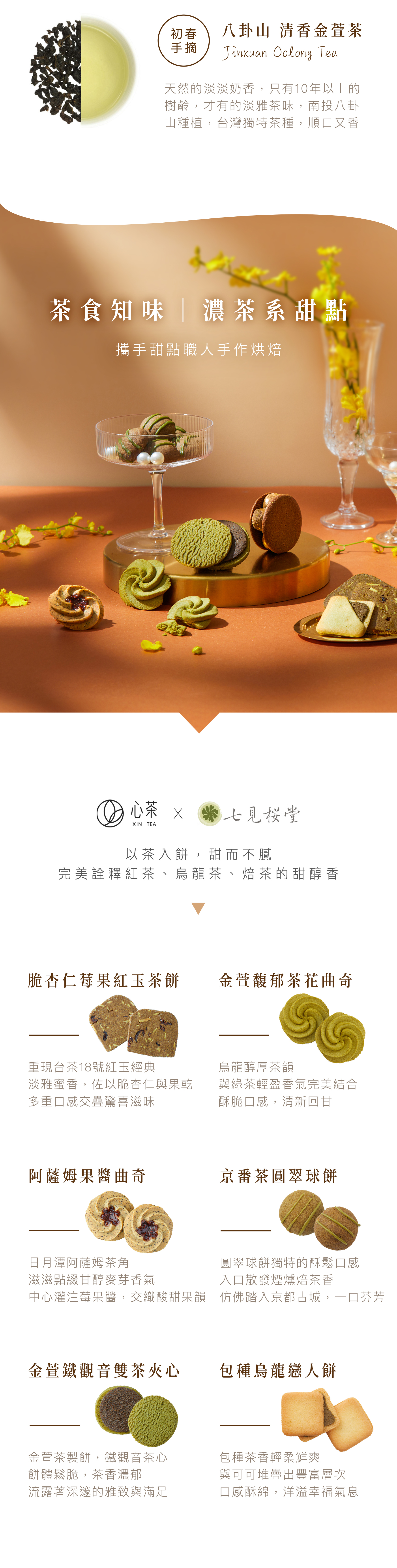 以紅玉、阿薩姆、焙茶、金萱茶、包種烏龍茶及鐵觀音製成6款手工餅乾,配口茶,換得浮生半日閒,心曠神怡。