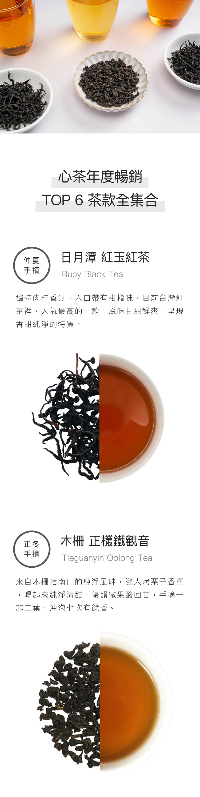 集結心茶 2022 年最受歡迎的前 6 名茶款:日月潭紅玉、正欉鐵觀音、和束町焙茶、台灣翠玉茶、金萱蜜紅茶與輕焙烏龍茶。下單即享免運,飽滿的大份量,祝福大家兔年圓滿,如意豐盛~